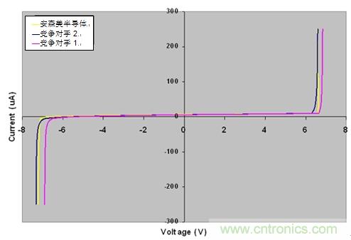 當(dāng)對以上器件的DC性能進(jìn)行比較的時候,結(jié)果看起來似乎是相同的(參見圖2所示曲線)。此外,它們都聲稱符合IEC61000-4-2第4級標(biāo)準(zhǔn),這就意味 著它們將都經(jīng)受住高達(dá)8 kV接觸電壓的ESD沖擊。確保保護(hù)敏感IC的ESD保護(hù)器件至關(guān)重要的性能不是DC性能; 盡管器件符合IEC61000-4-2的第4級標(biāo)準(zhǔn)是重要,但更重要的是保護(hù)IC。為確保在ESD事件期間IC沒有被損壞,保護(hù)二極管必須把ESD電壓鉗 位至足夠低的值,使IC不會損壞。