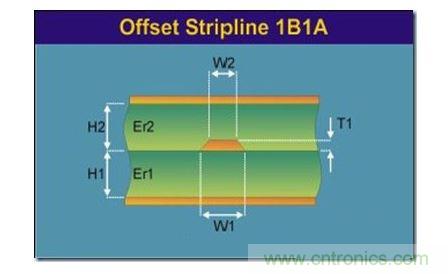帶狀線是置于兩個(gè)參考平面之間的帶狀導(dǎo)線,如下圖所示,H1和H2代表的電介質(zhì)的介電常數(shù)可以不同。