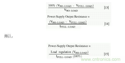 利用[12]式,可計(jì)算出RBISTABLE為0.320Ω。方程[9]的圖形表明,電源效率隨著RS的增加而跌落,在RS = RBISTABLE時(shí)跌落達(dá)20%。注意:該結(jié)論并不具有普遍性,對(duì)于每個(gè)應(yīng)用,必須分別進(jìn)行計(jì)算。RS的來(lái)源之一,是所有電源無(wú)法避免的、有限的輸出電阻,它可通過(guò)負(fù)載調(diào)整來(lái)確定,后者通常定義為: