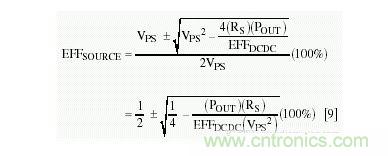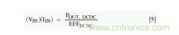 現(xiàn)在,我們有了足夠的信息來(lái)計(jì)算電源自身的耗散功率及其效率。因?yàn)殡娫措妷旱拈_(kāi)路值(VPS)已經(jīng)給出,我們僅需找出DC-DC轉(zhuǎn)換器的輸入電壓(VIN)。從等式[5]解出IIN:
