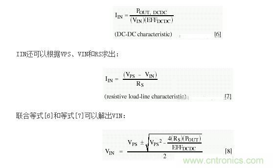 從該方程很容易得到能量損耗,并且圖3分析曲線中的有關(guān)參數(shù)也可以從中得到。舉例來(lái)說(shuō),如果串聯(lián)電阻(RS)等于零,電阻負(fù)載線的斜率將會(huì)變?yōu)闊o(wú)窮大。那么負(fù)載線就成為一條通過(guò)VPS的垂直線。在此情況下,VIN+ = VPS,效率為100%。隨著RS從0Ω增加,負(fù)載線繼續(xù)通過(guò)VPS,但越來(lái)越向左側(cè)傾斜。同時(shí),VIN+和VIN-匯聚于VPS/2,這也是50%效率點(diǎn)。當(dāng)負(fù)載線相切于I-V曲線時(shí),方程[8]只有一個(gè)解。對(duì)于更大的RS,方程沒(méi)有實(shí)數(shù)解,DC-DC轉(zhuǎn)換器將無(wú)法正常工作。