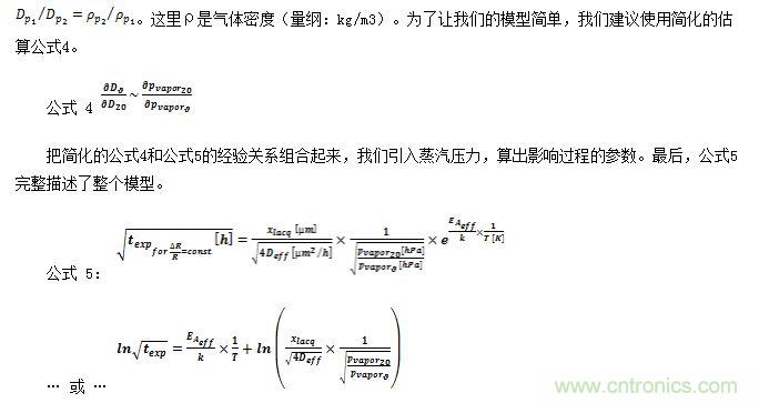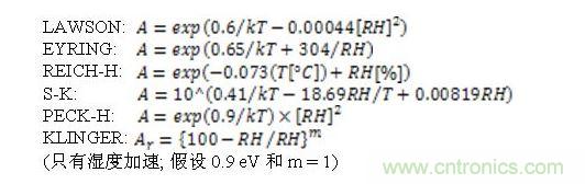 檢索現(xiàn)有文獻,Peck是提到的另一個作者。他改變了Lawson建議值,發(fā)現(xiàn)使用相對濕度能夠適應(yīng)他自己的測試結(jié)果。在一篇文章里,Hallberg很好地概括了所有濕度測試和加速模型,包括他自己的。過去30年,他與Peck對濕度加速進行了大量研究。在很多出版物里都提到,他們的研究成果的適應(yīng)性最好。圖8是Hallberg收集的可用模型。除了溫度意外,他們都使用相對濕度做為主要的測量參數(shù)。檢索最近幾年有關(guān)濕度加速的出版物,我們發(fā)現(xiàn),人們還在使用與Hallberg和Peck 描述或收集的模型相同的或可比較的模型。