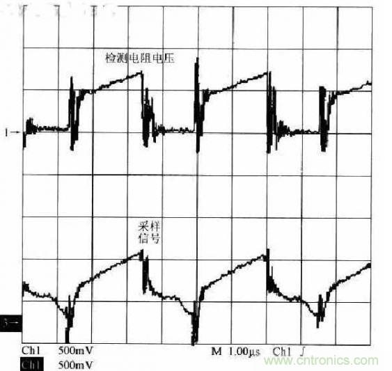 圖4給出了UC3842檢測(cè)電阻的電壓波形和采樣信號(hào)波形。從圖4中可以看出,經(jīng)過(guò)改進(jìn)后的電路,其采樣信號(hào)的波形緊緊跟隨檢測(cè)電阻的電壓波形,沒(méi)有出現(xiàn)非常大的尖峰電壓。因此,該電路能有效避免因變壓器漏感等異常干擾引起的電源誤操作的問(wèn)題,也能有效避免因電源占空比過(guò)大而引起的系統(tǒng)不穩(wěn)定的問(wèn)題。
