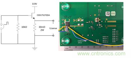 大多數(shù)電源評估模塊可以很容易地被配置為快速汲入電流的模式。圖1舉例說明了分立金屬氧化物半導體場效應晶體管(MOSFET)加可直接從輸出平面焊接到接地裝置的檢測