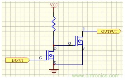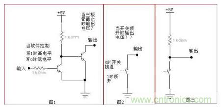 我們將圖1簡化成圖2的樣子。圖2中的開關(guān)受軟件控制,“1”時斷開,“0”時閉合。很明顯可以看出,當開關(guān)閉合時,輸出直接接地,所以輸出電平為0。而當開關(guān)斷開時,則輸出端懸空了,即高阻態(tài)。這時電平狀態(tài)未知,如果后面一個電阻負載(即使很輕的負載)到地,那么輸出端的電平就被這個負載拉到低電平了,所以這個電路是不能輸出高電平的。