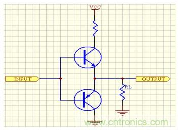 集電極開路輸出的結(jié)構(gòu)如圖1所示,右邊的那個三極管集電極什么都不接,所以叫做集電極開路(左邊的三極管為反相之用,使輸入為"0"時,輸出也為"0")。對于圖1,當左端的輸入為“0”時,前面的三極管截止(即集電極C跟發(fā)射極E之間相當于斷開),所以5V電源通過1K電阻加到右邊的三極管上,右邊的三極管導(dǎo)通(即相當于一個開關(guān)閉合);當左端的輸入為“1”時,前面的三極管導(dǎo)通,而后面的三極管截止(相當于開關(guān)斷開)。