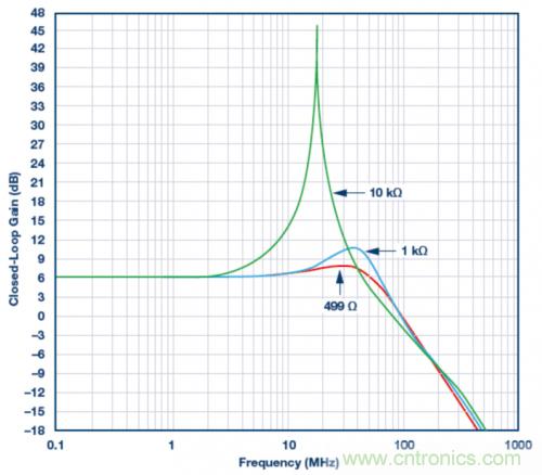 圖1. 使用不同反饋電阻的實(shí)驗(yàn)室結(jié)果。VS = ±5 V,VOUT = 40 mV p-p,RLOAD = 1 k?,RF值為499 ?、1 k?和10 k?。