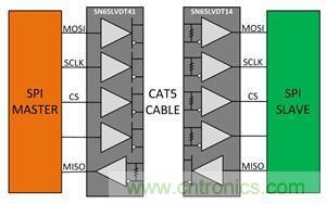 不過這里有一個(gè)簡單的解決方法:使用差分信號(hào)。諸如SN65LVDT41和SN65LVDT14的差分收發(fā)器接收SPI信號(hào),并將它們轉(zhuǎn)換為低壓差分信令(LVDS)。由于其抗噪性和帶寬,LVDS在SPI應(yīng)用中可以運(yùn)轉(zhuǎn)良好。