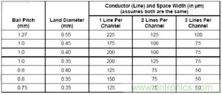 一旦完成了Dog bone型扇出,并且確定了特定的過孔焊盤尺寸,第二步就是定義從BGA進(jìn)入電路板內(nèi)層的走線寬度。確認(rèn)走線寬度時(shí)要考慮許多因素。表1顯示了走線寬度。走線之間要求的最小空間限定了BGA迂回布線空間。重要的是要知道,減小走線之間的空間將增加電路板制造成本。