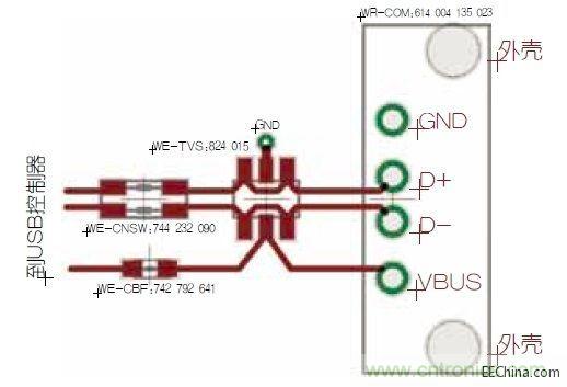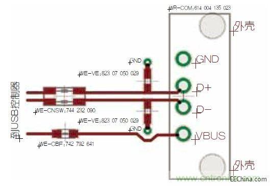 從圖3可以明顯看出,有兩條差分信號(hào)線(D+和D-)從插頭連接器連接到TVS二極管,再通過(guò)電流補(bǔ)償式數(shù)據(jù)線扼流圈連接到USB控制器。這樣能夠得到出色的靜電放電保護(hù)功能,并能良好的抑制數(shù)據(jù)線對(duì)。VBUS通過(guò)TVS二極管路由到貼片磁珠。在貼片磁珠之后,可以插入額外的電容和另一個(gè)貼片磁珠來(lái)實(shí)現(xiàn)最大可能的PI濾波器衰減。