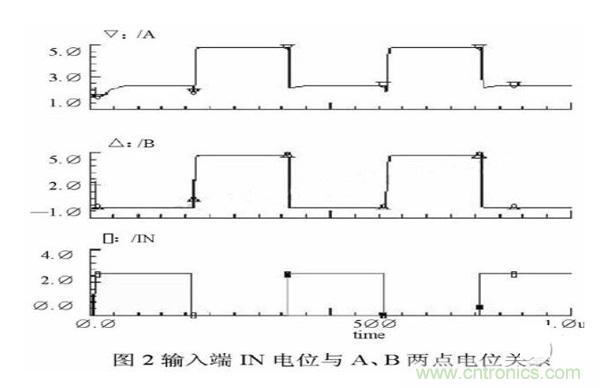實(shí)際上,B點(diǎn)電位與負(fù)載電容和電容Cboot的大小有關(guān),可以根據(jù)設(shè)計(jì)需要調(diào)整。具體關(guān)系將在介紹電路具體設(shè)計(jì)時(shí)詳細(xì)討論。在圖2中給出了輸入端IN電位與A、B兩點(diǎn)電位關(guān)系的示意圖。