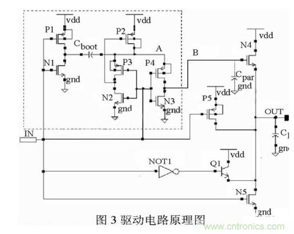 圖3中給出了驅(qū)動(dòng)電路的電路圖。驅(qū)動(dòng)電路采用Totem輸出結(jié)構(gòu)設(shè)計(jì),上拉驅(qū)動(dòng)管為NMOS管N4、晶體管Q1和PMOS管P5。下拉驅(qū)動(dòng)管為NMOS管N5。圖中CL為負(fù)載電容,Cpar為B點(diǎn)的寄生電容。虛線(xiàn)框內(nèi)的電路為自舉升壓電路。