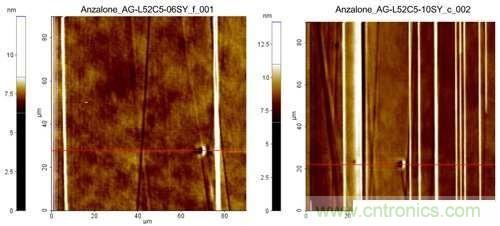 我們發(fā)現,氫氣蝕刻制程可以改進表面形貌,但同時也在外延層上引起不同類型的微階褶(SB)和整體階褶現象。AFM表面粗糙度分析表明,階褶會影響對樣品表面均勻性。兩個樣品都顯示一個約6nm高、1μm寬的階褶。圖3顯示了x0.5(左圖)和x3(右圖)樣品在階褶密度上存在明顯差異。