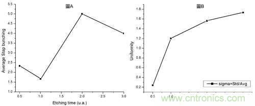 圖4.圖A為階褶數量與蝕刻時間的關系。圖B表面均勻度與蝕刻時間的關系。
