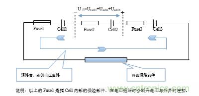 說(shuō)明:以上的Fuse1是指Cell內(nèi)部的保險(xiǎn)部件,在電芯短路時(shí)會(huì)斷開(kāi)電芯與外界的連接。 Fuse1Cell1Fuse2Cell2Fuse3Cell3+_U反=UCell1+Ucell2+UcellX外部短路部件短路后,新的電壓回路。