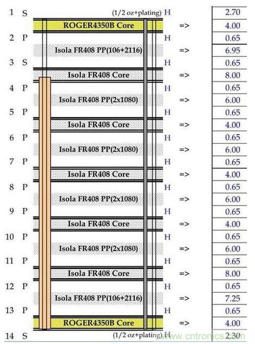 在混合疊層情形下,可以輕松地使用通用制造工藝技術(shù)將Rogers和高性能FR4混合在一起使用,因此也相對(duì)容易實(shí)現(xiàn)高的制造良率。Rogers疊層不需要專門的過孔準(zhǔn)備工序。