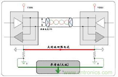 干擾不但影響信號,更嚴(yán)重的會導(dǎo)致板子死機(jī)或者燒毀,所以接口和電源的隔離是抗干擾的第一條“軍規(guī)”.隔離的主要目的是:避免地回流燒毀電路板和限制干擾的幅度,保護(hù)控制器不死機(jī)。如圖3所示,為未隔離時,兩個節(jié)點(diǎn)的地電位不一致,導(dǎo)致有回流電流,產(chǎn)生共模信號,CAN的抗共模干擾能力是-12~7V,超過這個差值則出現(xiàn)錯誤,如果共模差超過±36V,燒毀收發(fā)器或者電路板。