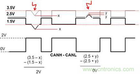 CAN總線為了提高抗干擾能力,采用CANH和CANL差分傳輸,達(dá)到效果就是遇到干擾后,可以“同上同下”,最后CANH-CANL的差分值保持不變。如圖7所示。