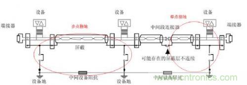 使用屏蔽線后,在屏蔽層沒有良好接大地前,屏蔽線是不起作用的。所以我們要選擇一種接地方式。通常來說,屏蔽層單點(diǎn)接地可以避免地回流(不同位置的地電位不同而導(dǎo)致的產(chǎn)生電流)、多點(diǎn)接地可以加快高頻干擾信號的泄放。所以要根據(jù)實(shí)際情況選擇合適的接地方式。如圖11所示。