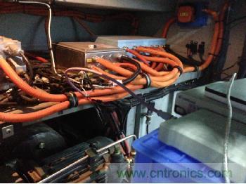 遠(yuǎn)離干擾源是最簡單的抗干擾方法,如果CAN線與強(qiáng)電干擾源遠(yuǎn)離0.5米,干擾就基本影響不到了。可是在實(shí)際布線中,經(jīng)常遇到空間太小而不得不和強(qiáng)電混在一起,如圖12所示,為某新能源汽車的驅(qū)動系統(tǒng),CAN線與驅(qū)動線混在一起,結(jié)果導(dǎo)致干擾很大。只要與CAN并行的驅(qū)動線,具備2A/秒的電流變化,就會耦合出強(qiáng)磁場而導(dǎo)致CAN線上出現(xiàn)干擾脈沖。所以CAN線必須要和電流會劇烈變化的線纜遠(yuǎn)離。比如繼電器、電磁閥、逆變器、電機(jī)驅(qū)動線等。