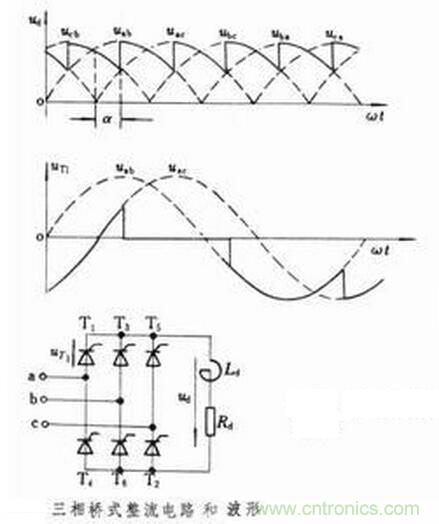 采用三相全控橋式整流電路時,輸出電壓交變分量的最低頻率是電網(wǎng)頻率的6倍,交流分量與直流分量之比也較小,因此濾波器的電感量比同容量的單相或三相半波電路小得多。另外,晶閘管的額定電壓值也較低。因此,這種電路適用于大功率變流裝置。