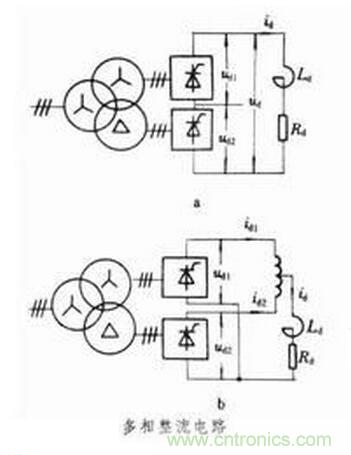 隨著整流電路的功率進一步增大(如軋鋼電動機,功率達數(shù)兆瓦),為了減輕對電網(wǎng)的干擾,特別是減輕整流電路高次諧波對電網(wǎng)的影響,可采用十二相、十八相、二十四相,乃至三十六相的多相整流電路。圖3a為兩組三相橋串聯(lián)組成的十二相整流電路。為了獲得十二相波形,每個波頭應(yīng)該錯開30°。所以采用三繞組變壓器,次級的兩個繞組一個接成星形,另一個接成三角形,分別供給兩組三相橋。兩組整流橋串聯(lián)后再接到負載。由于兩組整流橋輸出的電壓的相位彼此差30°,因此在負載上得到十二脈波的整流電壓,合成電壓中最低次諧波頻率為600Hz,輸出電壓ud=ud1+ud2,電流id=id1=id2。圖3b是兩組三相橋并聯(lián)組成大電流的十二相整流電路。兩橋變壓器次級繞組電壓依次相差30°。若兩組橋的交流線電壓相等,各自的控制角也相等,則兩組橋的整流平均電壓也相等,只要極性相符合,就可以并聯(lián)運行。但是兩組整流電壓的瞬時值是不等的,兩組電源間會出現(xiàn)交流環(huán)流。為了限止環(huán)流,延長晶閘管的導通時間,需要加入平衡電抗器,輸出電壓ud=(ud1+ud2)/2,電流id=id1+id2。