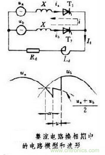 式中Ud為考慮了負載電流引起的電壓降時的直流電壓,k是與電路有關(guān)的常數(shù),X是換相電抗,Id為直流平均電流。由式(1)可見,電壓降主要由交流側(cè)電抗引起,由換相重疊現(xiàn)象引起的電壓降與換相結(jié)束時的直流側(cè)電流成正比。從直流側(cè)看,交流側(cè)電抗起著一個等效電阻的作用。