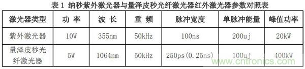 皮秒光纖激光器是在超快激光基礎(chǔ)上開發(fā)出的新一代激光器,尤其是近年來光纖器的研制成功,標(biāo)志著激光技術(shù)的一次飛躍進(jìn)步,與固體納秒激光相比,皮秒光纖激光器具有以下優(yōu)點(diǎn):1.激光脈沖寬度更窄,僅為 10^-12S,從上述材料吸收激光能量轉(zhuǎn)化為熱能的擴(kuò)散距離公式可知,這將大大減小激光加工材料時(shí)的熱擴(kuò)散距離,降低激光對(duì)材料的熱損傷;2.因脈沖寬度變窄,激光單脈沖峰值功率成倍增加,提升了激光加工材料的能力;3.光纖激光器以細(xì)小的光纖作為激光的傳輸和放大介質(zhì),與固體放大結(jié)構(gòu)相比,不僅工作穩(wěn)定,免除了周期性的調(diào)校工作,降低了維護(hù)成本,而且結(jié)構(gòu)小巧,制造成本相對(duì)較低。表1是量澤激光公司研制的光纖器與目前市面上主流的納秒級(jí)固體紫外激光器的參數(shù)對(duì)照: