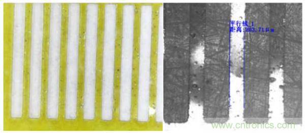 圖3.皮秒光纖激光器PI 膜開窗(左圖為 0.5mil 厚,右圖為 1mil 厚)
