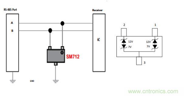 對(duì)RS485接口的特點(diǎn)是收發(fā)電平的不對(duì)稱,為7V 和12V,所以需要專門設(shè)計(jì)不對(duì)稱的保護(hù)芯片,而SM712 SOT-23封裝,專為保護(hù)具有非對(duì)稱工作電壓(-7V至12V)的RS-485應(yīng)用而設(shè)計(jì),使其免受靜電放電(ESD)、電氣快速瞬變(EFT)和雷電引致的浪涌電流帶來的危害。 它能吸收高于IEC 61000-4-2國(guó)際標(biāo)準(zhǔn)規(guī)定之最高級(jí)別的反復(fù)性ESD放電 30KV,無需擔(dān)心其性能發(fā)生減退,并可在極低的箝位電壓下安全地耗散19A的8/20μs波形浪涌電流(IEC61000-4-5)。