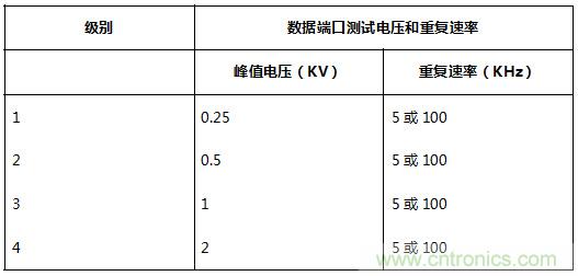 IEC 61000-4-4規(guī)定了不同環(huán)境狀況下的電壓測試級別,分為4級。同時規(guī)定了不同測試級別對應(yīng)的測試電壓和脈沖重復(fù)速率。