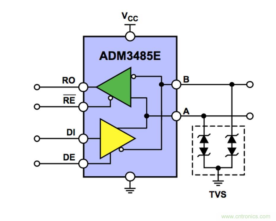 重要的是要確保TVS的擊穿電壓在受保護引腳的正常工作范圍之外。CDSOT23-SM712的獨有特性是具有+13.3 V和–7.5 V的非對稱擊穿電壓,與RS-485芯片ADM3485E的+12 V至–7 V的收發(fā)器共模范圍相匹配,從而提供最佳保護,同時最大限度地減小對RS-485收發(fā)器的過壓應(yīng)力。