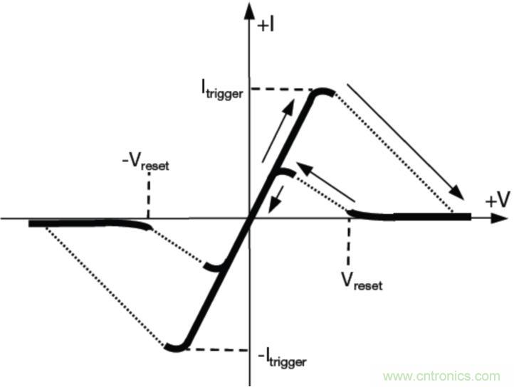 TISP的非線性電壓-電流特性通過轉(zhuǎn)移產(chǎn)生的電流來限制過壓。作為晶閘管,TISP具有非連續(xù)電壓-電流特性,它是由于高電壓區(qū)和低電壓區(qū)之間的切換動作而導(dǎo)致的。在TISP器件切換到低電壓狀態(tài)之前,它具有低阻抗接地路徑以分流瞬變能量,雪崩擊穿區(qū)域則導(dǎo)致了箝位動作。