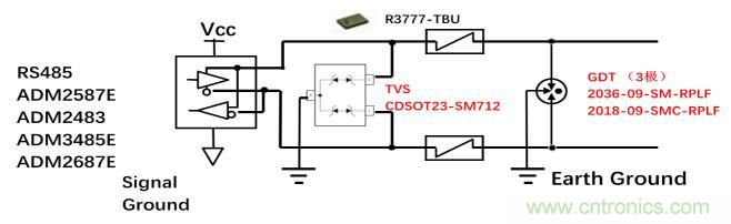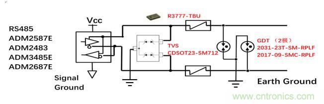 如果要提高浪涌保護級別,保護電路變將得更加復(fù)雜,在方案二中,我們將浪涌保護提高到四級。