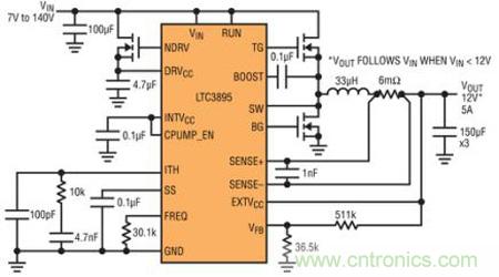 圖 1:顯示 LTC3895 在 7V 至 140V 輸入電壓范圍內(nèi)產(chǎn)生 12V 輸出的原理圖