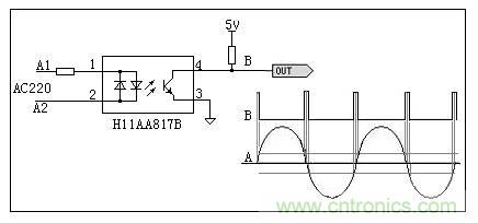 過零點檢測可采用硬件實現(xiàn),在硬件設計中,可以增加如圖4 或圖5過零點的硬件檢測電路,通過在B端輸出為高電平時進行按鍵狀態(tài)的判斷,以期在電磁輻射最小的時候對觸摸按鍵進行檢測。