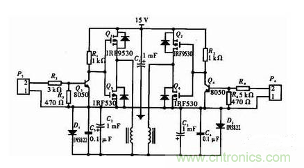 是由兩只p溝道MOSFET。Q1、Q2和兩只n溝道MOSFET Q5、Q6組成。在這里沒有采用4只n溝道MOSFET,原因是驅(qū)動(dòng)電路復(fù)雜,如果采用上面的驅(qū)動(dòng)電路接近電源的兩個(gè)導(dǎo)體管不能完全導(dǎo)通,發(fā)熱量為接近地一側(cè)導(dǎo)體管4倍以上,功耗增加,所以采用對管逆變即減小了功耗,而且驅(qū)動(dòng)電路簡單。通過控制4個(gè)導(dǎo)體管的開關(guān)速度再通過低通濾波器即可實(shí)現(xiàn)DC/AC功能。