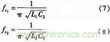 兩個(gè)肖特基整流二極管1N5822為續(xù)流二極管,這里為防止產(chǎn)生負(fù)電壓,C2、C3、C4、C5、L1、L2組成低通濾波器,其中C5、C6為瓷片電容,C2、C3用電解電容,充放電電流可以流進(jìn)地,L1、L2為帶鐵芯的電感,帶鐵芯的電感對高頻的抑制比空心電感更好,電感值更高。關(guān)于參數(shù)的選取和截止頻率的計(jì)算如下