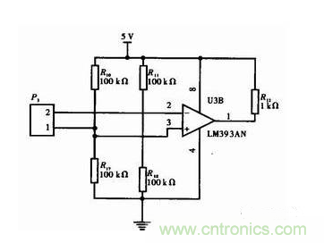 由于終端負(fù)載一定,所以電流采樣實(shí)際等同于一個(gè)峰值檢測的過程,此電路實(shí)際是一個(gè)峰值檢測電路,P3為信號的2個(gè)輸入端,調(diào)整R10,R11和R17、R18取值來實(shí)現(xiàn)峰值測功能,電路中的阻值并不準(zhǔn)確,需要實(shí)際中根據(jù)信號的幅值來調(diào)整R10、R11和R17、R18阻值和比值。R14、R15、R19、R20的電流為模擬比較器內(nèi)部偏置電流的10倍以上,電阻的阻值盡可能大,這樣既減小了功耗也保證了系統(tǒng)的穩(wěn)定性。Y3采用模擬比較器LM393,LM393內(nèi)部為開集電極輸出,應(yīng)用的時(shí)候輸出端要接一個(gè)上拉電阻,電路如圖3所示。