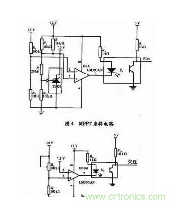 模擬比較器LM393的正相輸入端3腳位固定電壓7.5 V,正常狀態(tài)下PD4采集到的為高電平,當(dāng)2腳的電壓高于7.5 V時(shí)輸出端1腳輸出低電平,光耦導(dǎo)通,PD4采集到的為低電平開始處理SPWM信號調(diào)整輸出阻抗來實(shí)現(xiàn)恒電壓跟蹤,最終實(shí)現(xiàn)最大功率點(diǎn)跟蹤。電路如圖4所示。