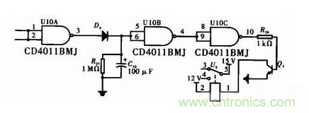 此部分電路的設(shè)計(jì)采用雙輸入四與非門CD4011做反相器、開關(guān)二極管D6、電阻R27、電解電容C10、三極管2N3904和繼電器。R26的選取由繼電器的驅(qū)動(dòng)電流和2N3904的放大倍數(shù)β來決定,過小則增加功耗,過大則不能驅(qū)動(dòng)繼電器。R27和C10的放電時(shí)間就是系統(tǒng)過流欠壓保護(hù)后檢測的間隔時(shí)間。時(shí)間T=2×R27×C10。