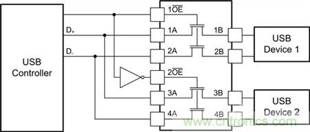 圖2:將2個USB器件復(fù)用至單個USB控制器