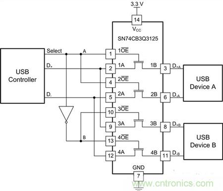 圖4:將2個USB器件復(fù)用至一個控制器時的SN74CB3Q3125接線