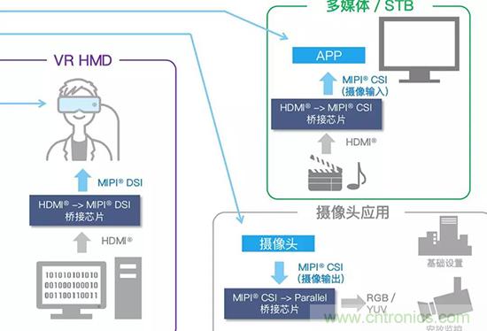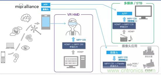 例如VR技術(shù),VR是使用高清晰的小型顯示設(shè)備,其實(shí)這是從原來(lái)的智能手機(jī)顯示屏發(fā)展而來(lái)。智能手機(jī)主要使用MIPI等接口方式,但是VR是從PC轉(zhuǎn)變來(lái)的,它采用了大量高清晰度圖像。主要使用HDMI接口。隨著手機(jī)進(jìn)入到VR領(lǐng)域,就會(huì)遇到接口不統(tǒng)一的挑戰(zhàn)。