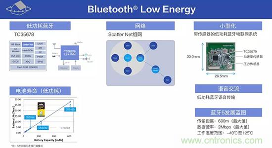 針對(duì)這樣的應(yīng)用場(chǎng)景,東芝推出了整合了控制芯片的藍(lán)牙芯片,是迄今實(shí)現(xiàn)的功耗最低藍(lán)牙芯片,新的藍(lán)牙芯片可以實(shí)現(xiàn)組網(wǎng),可應(yīng)用到體積很小的設(shè)備上,且可以通過(guò)新版本,實(shí)現(xiàn)長(zhǎng)達(dá)600米通信距離,最大電流是3.3毫安,一顆鈕扣電池可以使用3到4年。