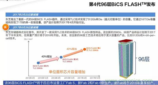 東芝電子(中國(guó))有限公司副總經(jīng)理野村尚司表示東芝在2017年已經(jīng)推出了最新一代的64層BiCS FLASH器件,通過(guò)采用TLC技術(shù)實(shí)現(xiàn)了512Gb單Die(晶元切割單位)的容量。它通過(guò)16個(gè)Die堆疊 結(jié)構(gòu)實(shí)現(xiàn)了1TB的單一封裝容量,該產(chǎn)品計(jì)劃于2017年4月開(kāi)始付運(yùn)。