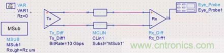 前面說到,銅箔的粗糙度會影響到信號完整性,那么我們就來做一個實驗看看。原理圖如下所示,把銅箔粗糙度的設(shè)置為一個變量,初始值為0,仿真的速率為10Gbps: