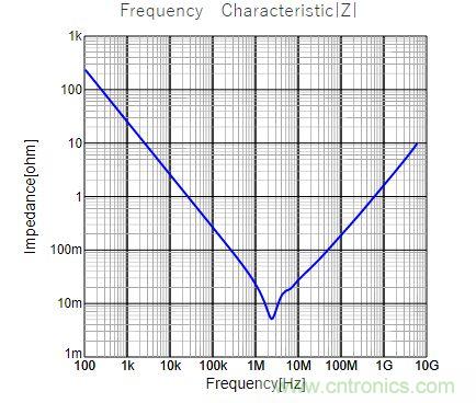 MLCC有經(jīng)典的V型阻抗-頻率曲線。隨著頻率升高,寄生電感的影響開始凸顯,阻抗先變小再變大,這是MLCC的固有特性。曲線中的最低點就是MLCC的自諧振頻率。