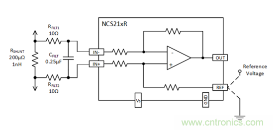 其他應(yīng)用,如DC-DC轉(zhuǎn)換器和電源應(yīng)用也可能需要在電流檢測(cè)放大器的輸入端進(jìn)行濾波。圖1所示為建議的輸入濾波原理圖。