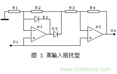 圖5 和 圖6 要求R1=2R2=2R3,增益為1/2,缺點是:當輸入信號正半周時,輸出阻抗比較高,可以在輸出增加增益為2的同相放大器隔離.另外一個缺點是正半周和負半周的輸入阻抗不相等,要求輸入信號的內(nèi)阻忽略不計。
